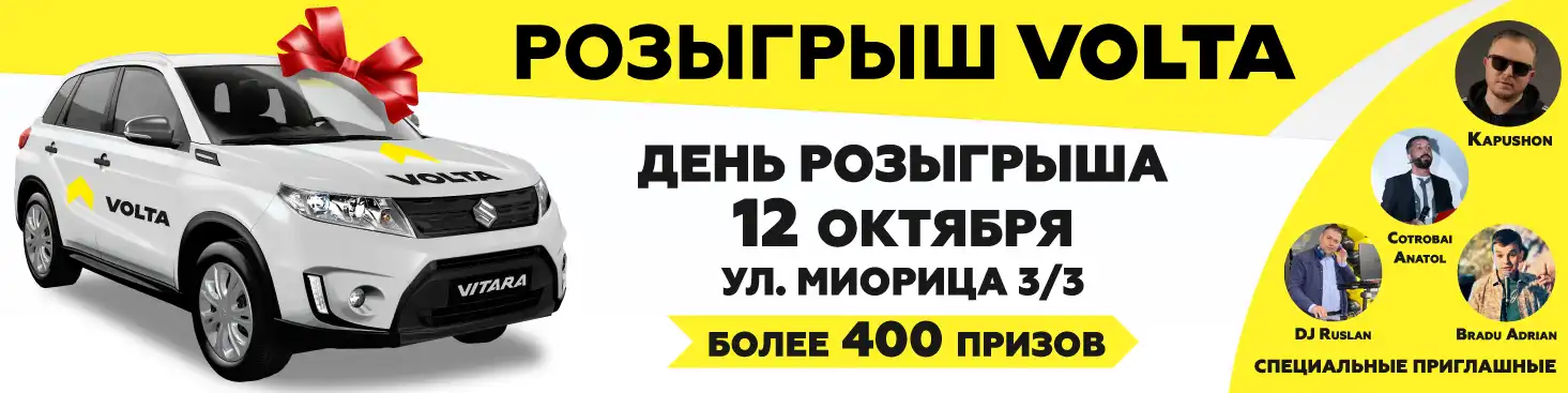 Розыгрыш призов состоится 12.10.2024, начиная с 12:00, в магазине VOLTA 6, расположенном по адресу ул. Миорица 3/3, Кишинев.